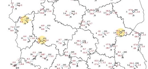 Poranne pomiary temperatury wskazują na kontrast termiczny między północą a zachodem: od –1°C na północnym wschodzie po około 5°C w strefie nadmorskiej. Wraz z napływem chłodniejszej masy PPm strefa temperatur ujemnych będzie stopniowo rozszerzać się na centrum kraju. W wielu regionach warunki sprzyjają utrzymaniu się i utrwalaniu pokrywy śnieżnej.