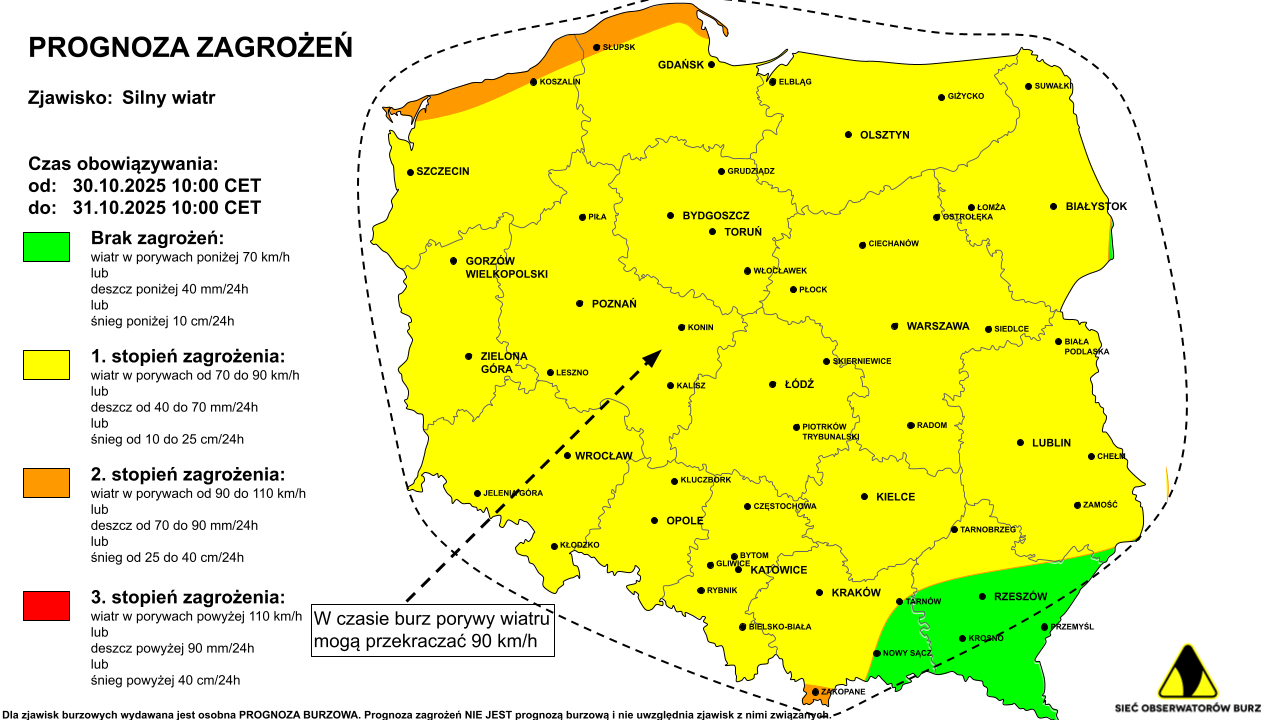 Prognoza burzowa i ostrzeżenie przed silnym wiatrem na 30.10.2025 i noc z 30/31.10.2025